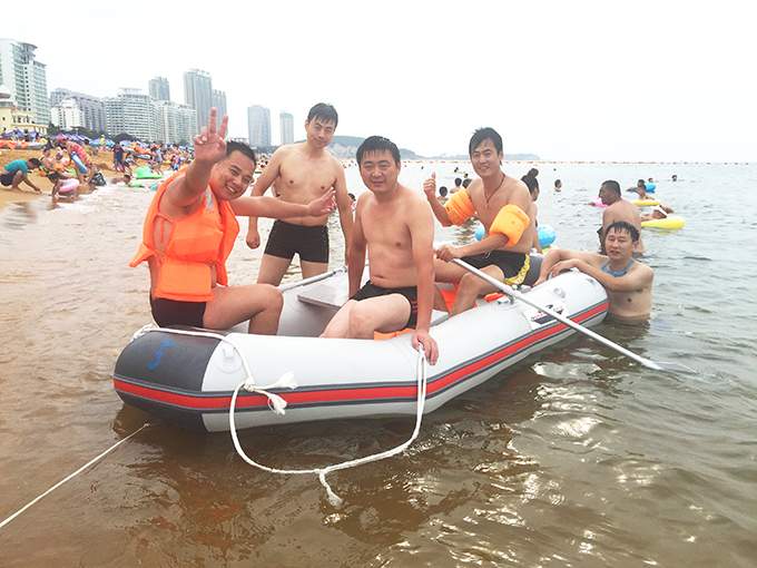 吃過午飯,我們一行人來到了威海國際海水浴場(chǎng),不愧是國際海水浴場(chǎng),灘緩沙細(xì),水質(zhì)清澈,松林環(huán)繞?;ú荨⑹顸c(diǎn)綴于岸邊,令人新曠神怡。看著那迷人的海灘和不斷奔涌而上的浪潮,遠(yuǎn)處氣勢(shì)磅礴的海面卷起的層層浪花,走在沙灘上,感受著浪花在腳上一次次的沖刷。換上泳衣,租個(gè)皮劃艇,同事們迫不及待的開始下水了。