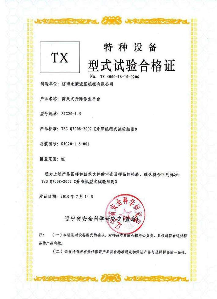 固定剪叉升降平臺(tái)合格證
